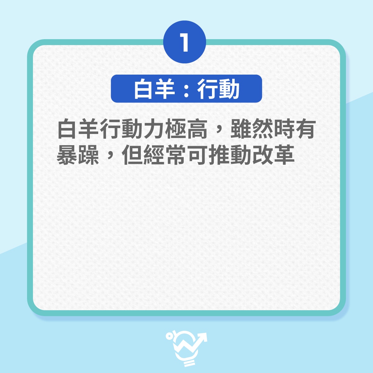 天性是行動派,任何職場位置都是一馬當先,行動力極高,有時會見到白羊暴躁的一面,但因行動力強,經常有推動改革,同事都會多多包容他脾氣,令工作出現奇蹟。