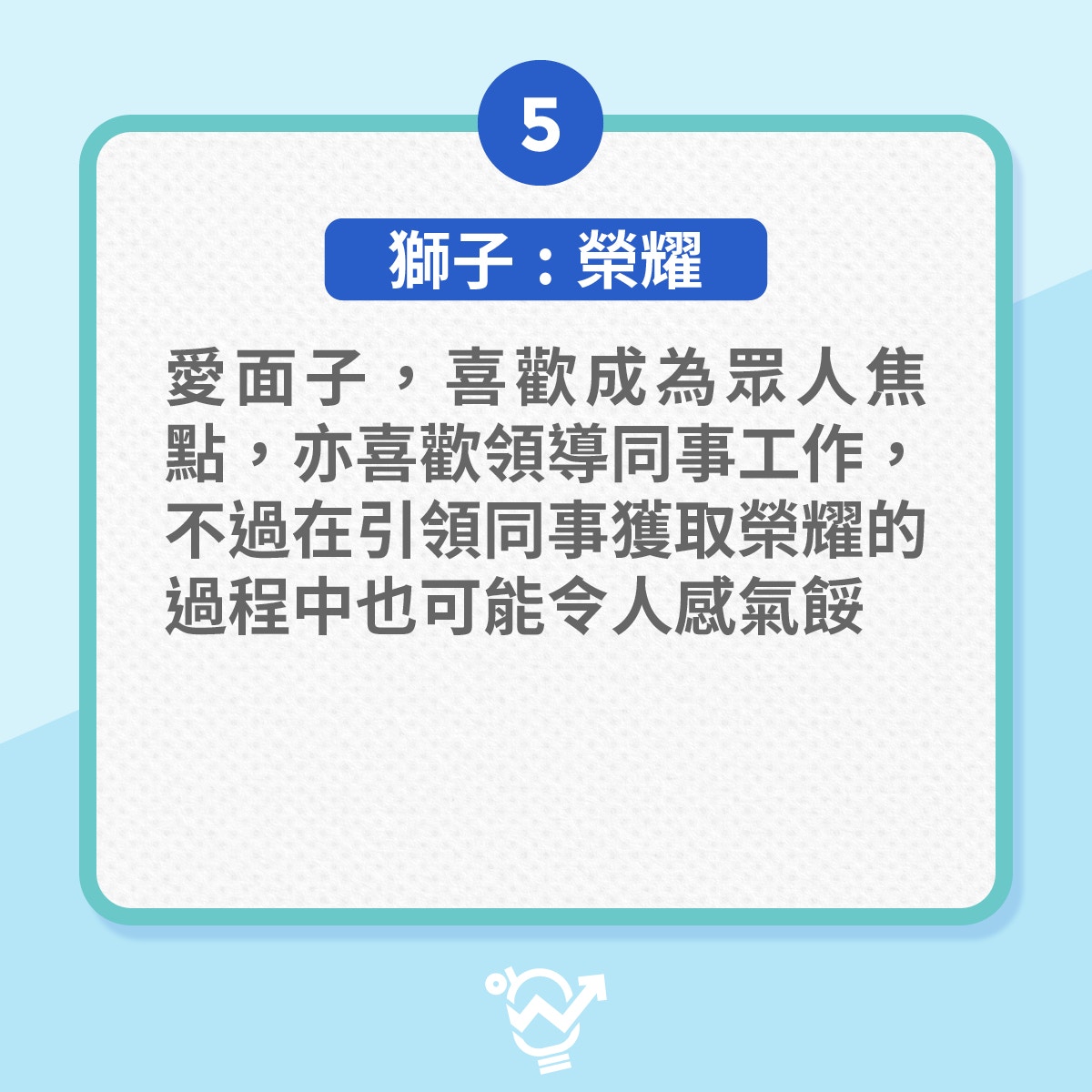 十個有八個獅子座都是愛面子,喜歡成為眾人焦點,所以工作時喜歡以大哥大姐身份領導,更會執着同事對他的承諾,有沒有勇氣面對任何挑戰。當整項計劃完成時會深感榮耀,但有時這態度會同事感到氣餒。