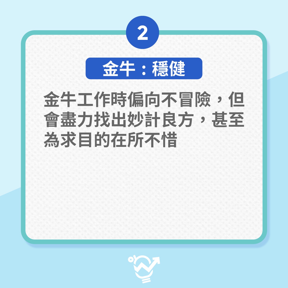 生活極需要安全感,所以工作時偏向不冒險,但會盡力找出妙計良方,確保執行的事可以準確無誤的完成,甚至有時為求目的在所不惜。請參考【職場12星座】了解金牛女自負個性起源。